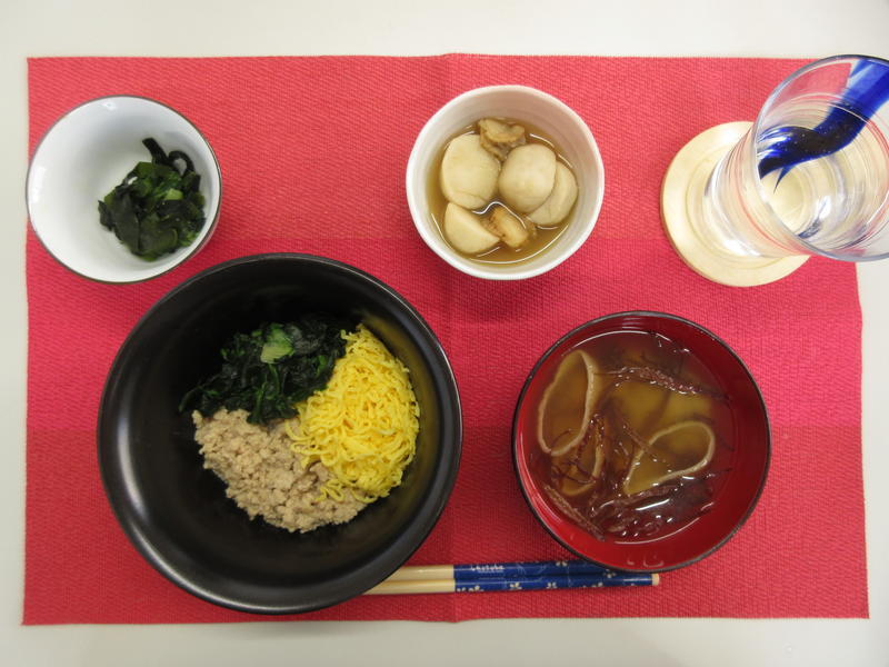 三色丼、みそ汁、里芋と帆立の煮物、胡瓜の酢味噌和え