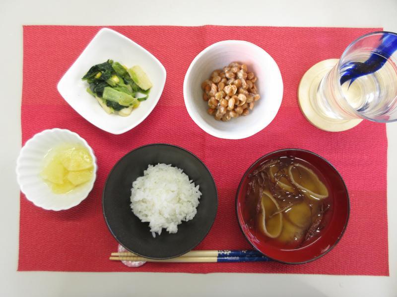 ごはん、みそ汁、納豆、小松菜のオイスター炒め、パインのシロップ漬け