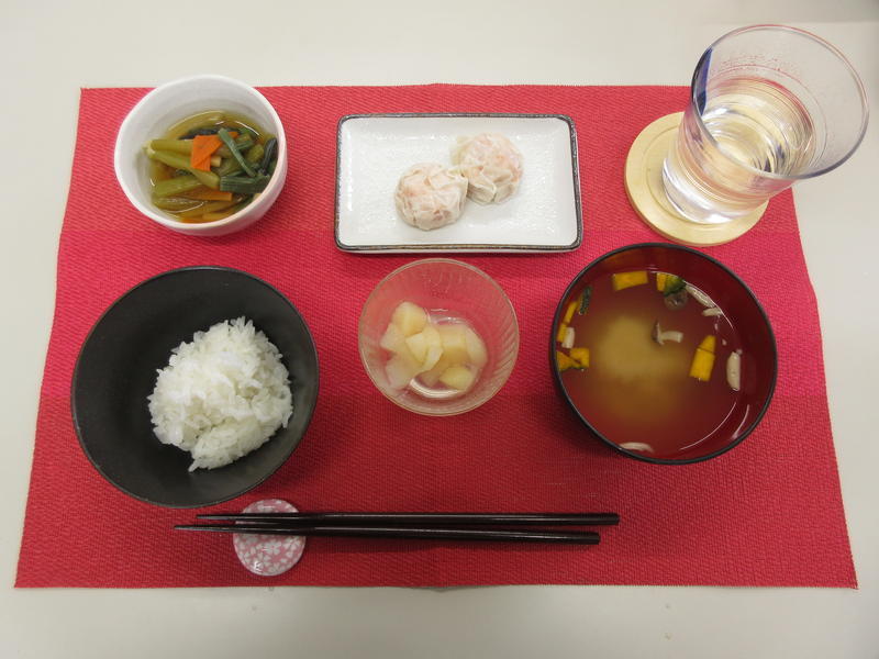 ごはん、みそ汁、かにシューマイ、山菜煮、梨のシロップ漬け