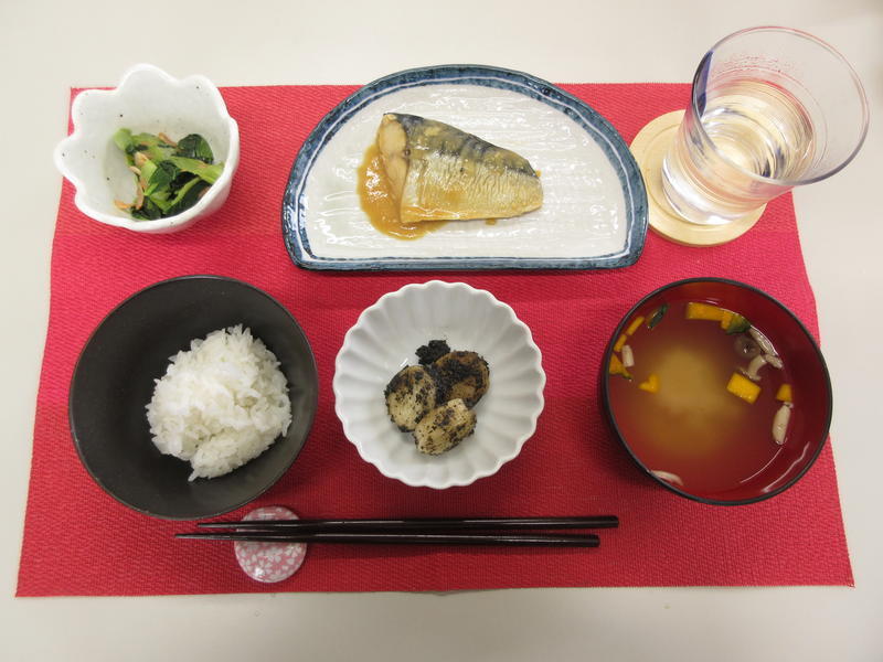 ごはん、すまし汁、さばの味噌煮、青梗菜の塩炒め、芋餅の胡麻よごし