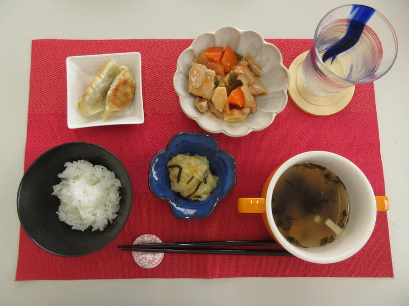 ごはん、中華スープ、酢鶏、味付餃子、キャベツの塩昆布和え