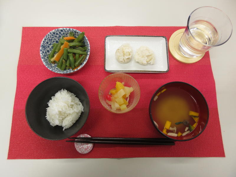 ごはん、みそ汁、豆腐シューマイ、いんげんの炒め煮、フルーツカクテル