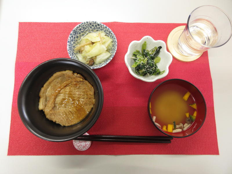 豚丼、みそ汁、キャベツの塩煮、小松菜のしらす和え