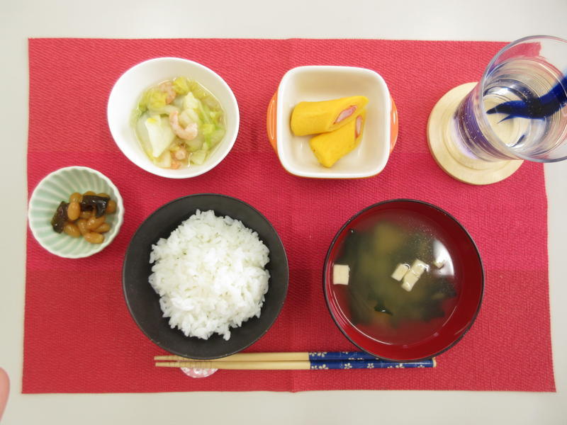 ごはん、みそ汁、かにかまロール、白菜と海老の塩煮、豆昆布
