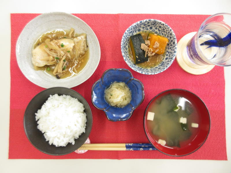ごはん、みそ汁、白身魚の和風きのこあんかけ、南瓜のそぼろ煮、大根のしそ和え