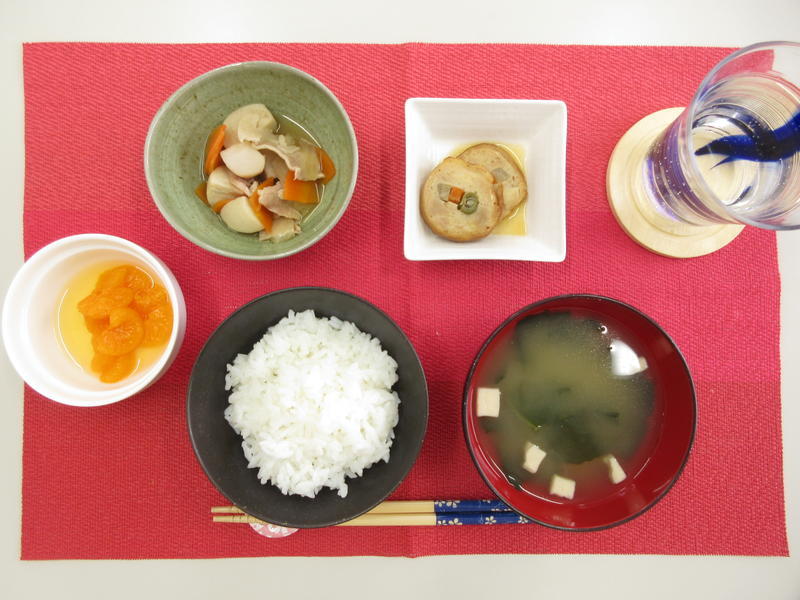 ごはん、みそ汁、鶏肉の八幡巻き、里芋の肉じゃが、みかんのシロップ漬け