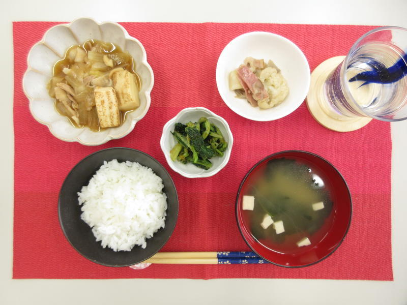 ごはん、みそ汁、肉豆腐、カリフラワーとベーコンのソテー、小松菜のとびっこ和え