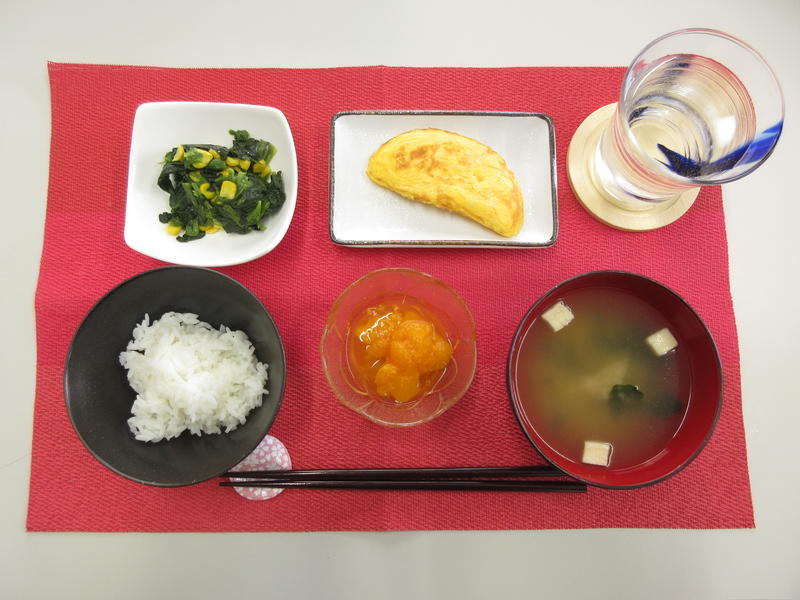 ごはん、みそ汁、オムレツ、ほうれん草のバター炒め、みかんのシロップ漬け