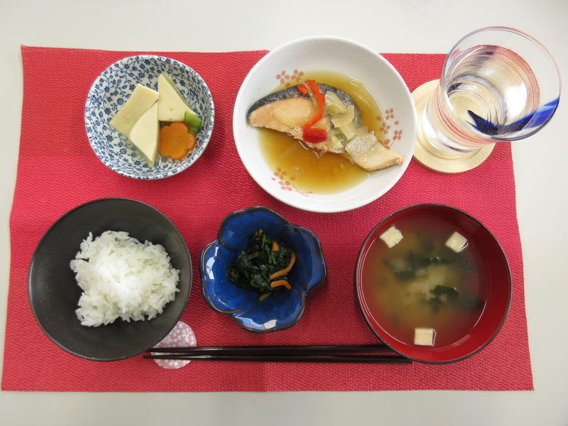 ごはん、みそ汁、鮭の南蛮漬け、高野豆腐の含め煮、ほうれん草のおかか和え