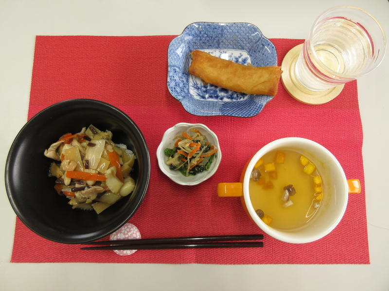 中華丼、中華スープ、チーズ春巻き、三色ナムル