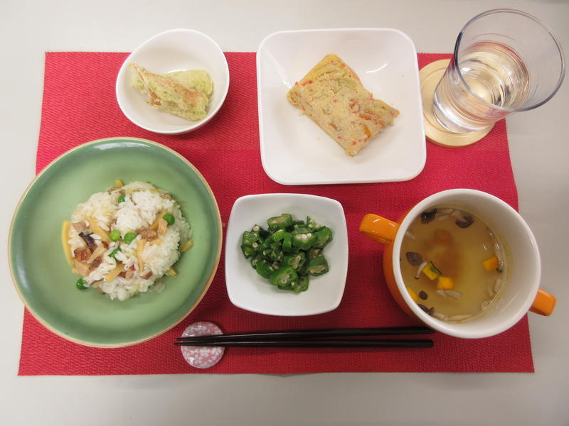 焼き豚チャーハン、中華スープ、かに風味五目卵焼き、磯部揚げ、おくらの生姜和え