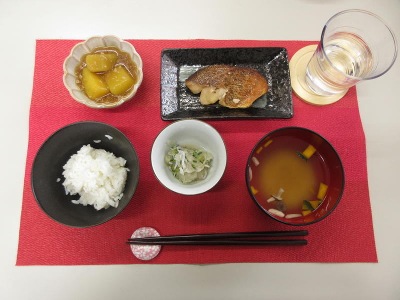 ごはん、みそ汁、メバルのみりん焼き、さつま芋のそぼろ煮、大根の梅サラダ