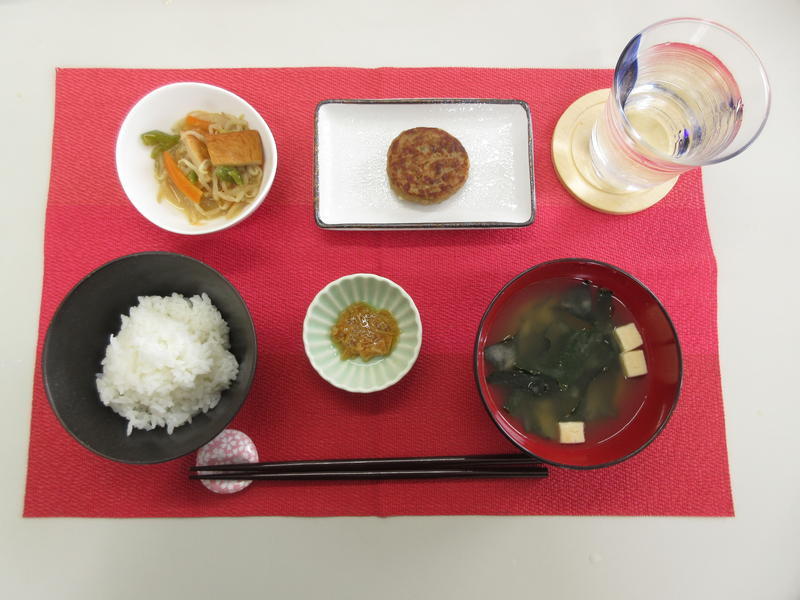 ごはん、みそ汁、ミニハンバーグ、もやしの味噌炒め、なめ茸