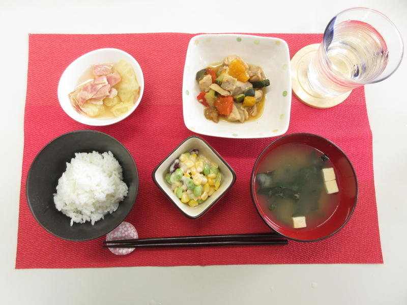 ごはん、みそ汁、彩野菜と鶏肉の黒酢あんかけ、キャベツのコンソメ煮、ビーンズサラダ