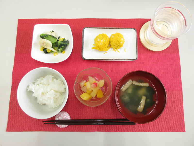 ごはん、みそ汁、錦糸卵のえびしんじょう、カリフラワーのソテー、フルーツカクテル