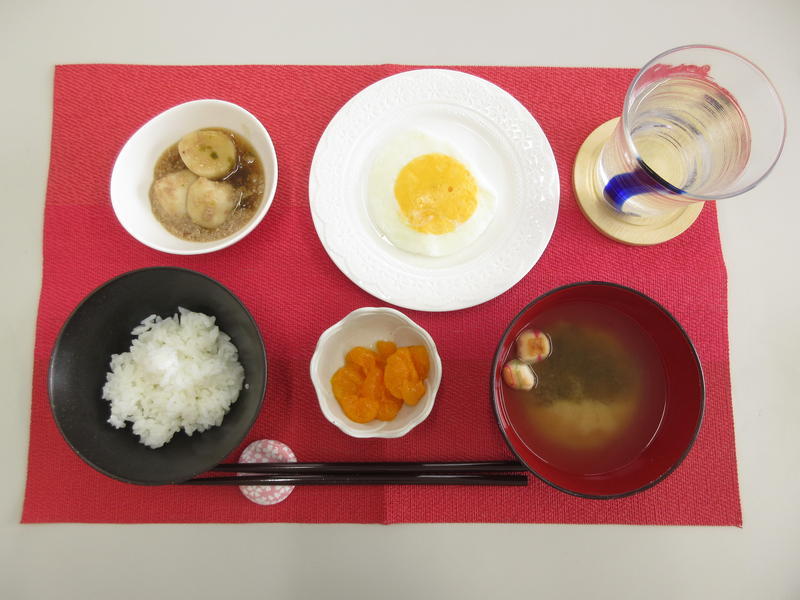 ごはん、みそ汁、目玉焼き、里芋のそぼろ煮、みかんのシロップ漬け
