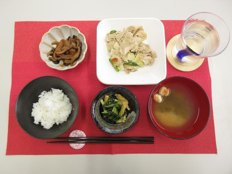 ごはん、みそ汁、豚肉とキャベツの塩炒め、あわび茸のしぐれ煮、小松菜と揚げの生姜和え