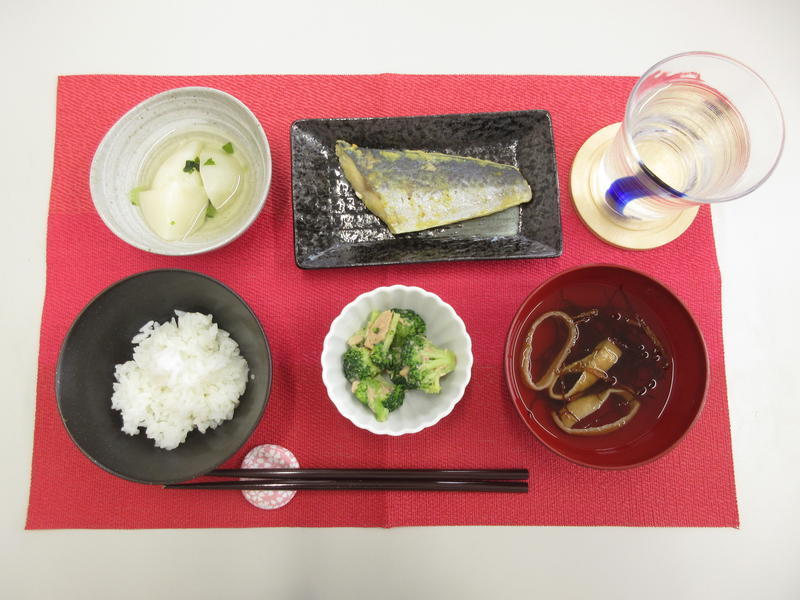 ごはん、すまし汁、さわらの西京焼き、かぶと葉大根の白だし煮、ブロッコリーのツナ和え