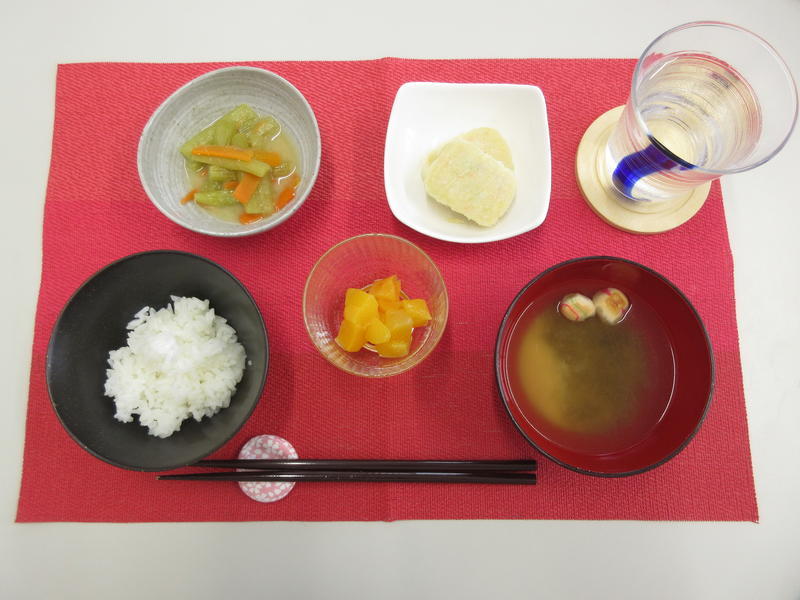 ごはん、みそ汁、豆腐ナゲット、ふきの味噌煮、桃のシロップ漬け