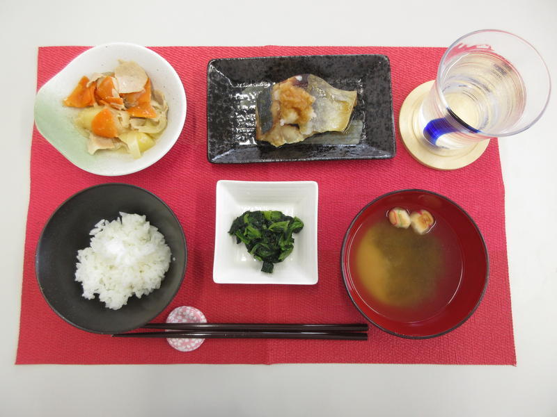 ごはん、みそ汁、あじのすだち醤油、肉じゃが、ほうれん草の海苔和え