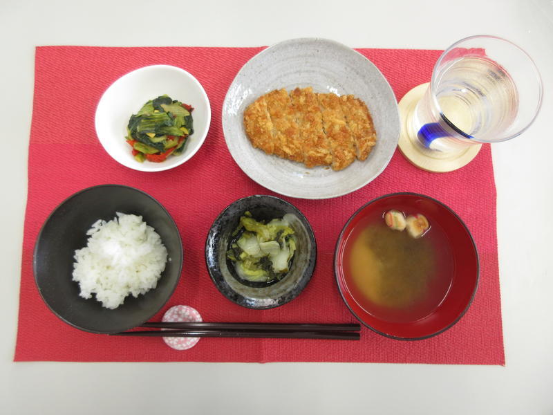 ごはん、みそ汁、とんかつ、青梗菜のオイスター炒め、白菜の甘酢和え