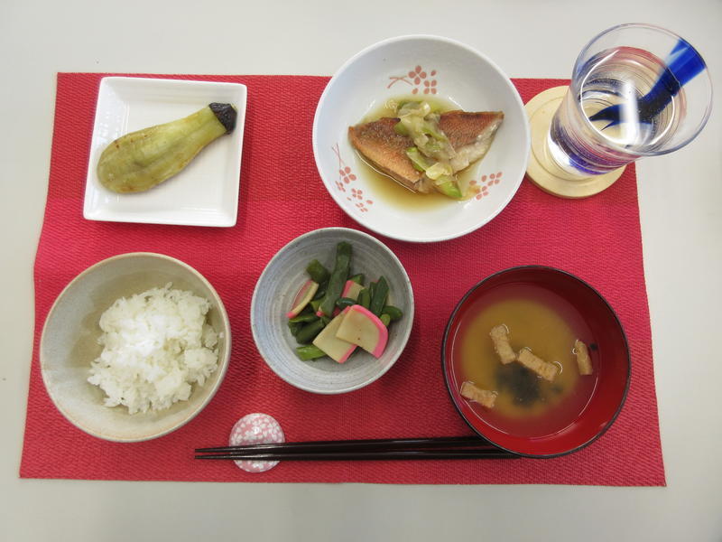 ごはん、みそ汁、赤魚の煮つけ、いんげんと蒲鉾の炒め煮、焼き茄子