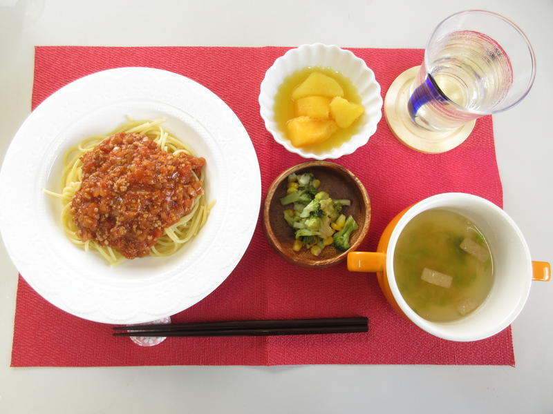 ミートソーススパゲッティ、コンソメスープ、さつま芋のオレンジ煮、フレンチサラダ