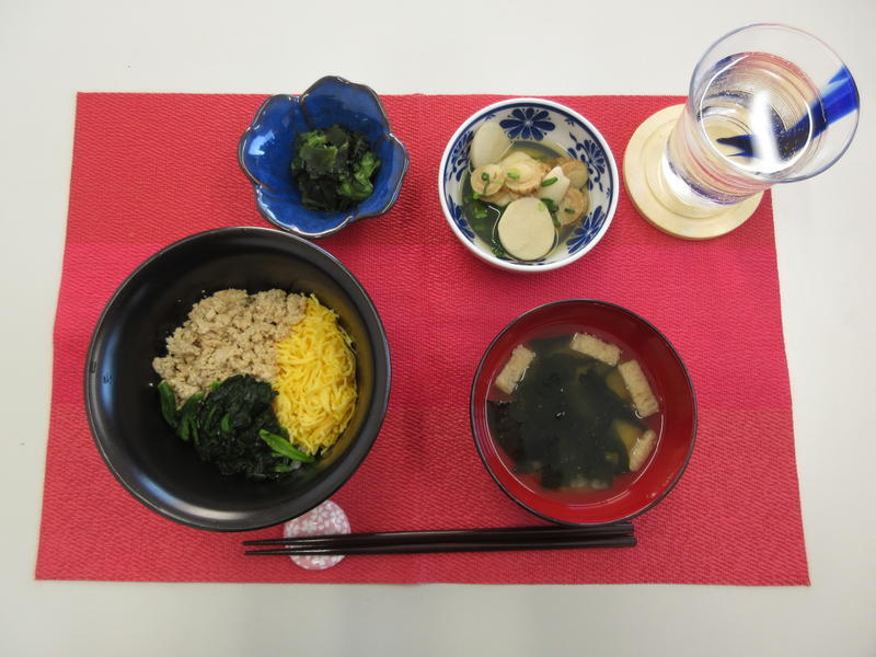 三色丼、みそ汁、里芋と帆立の煮物、胡瓜の酢味噌和え