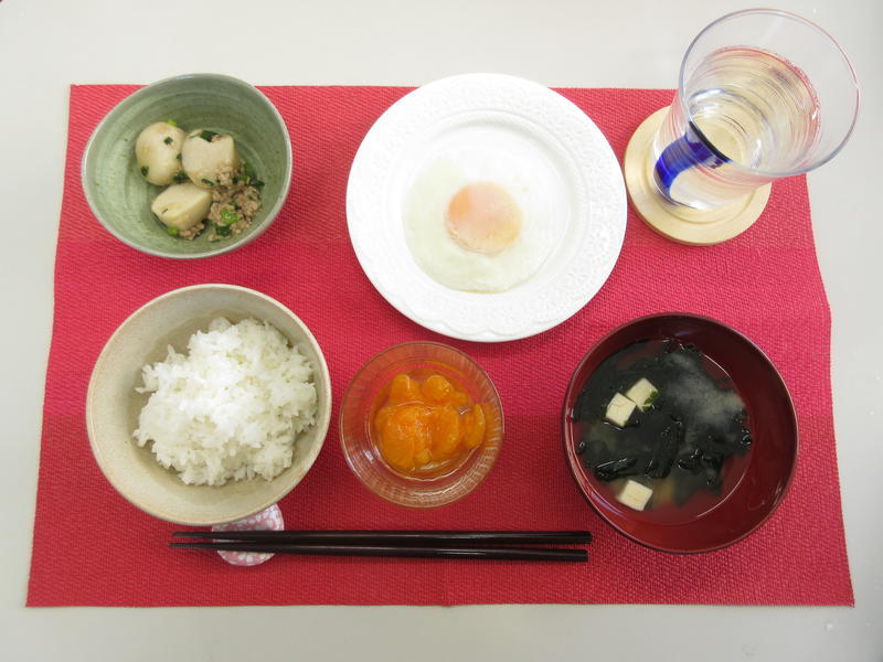 ごはん、みそ汁、目玉焼き、里芋のそぼろ煮、みかんのシロップ漬け