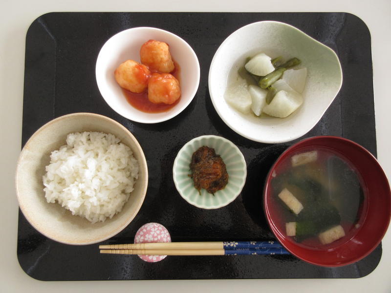 ごはん、みそ汁、えび団子の甘酢あん、大根といんげんの白だし煮、松前漬け