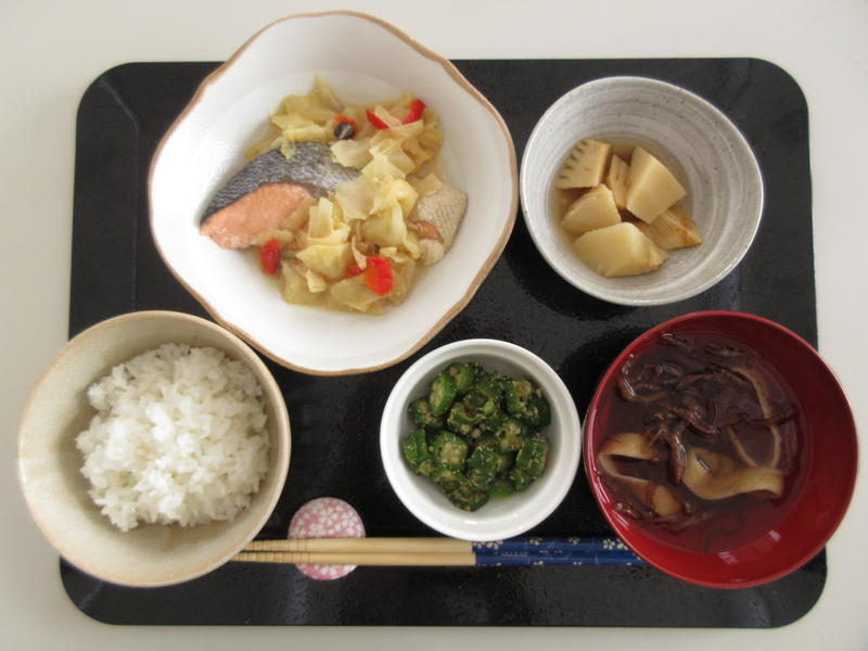 ごはん、すまし汁、鮭のちゃんちゃん焼き、筍のおかか煮、おくらの胡麻酢和え