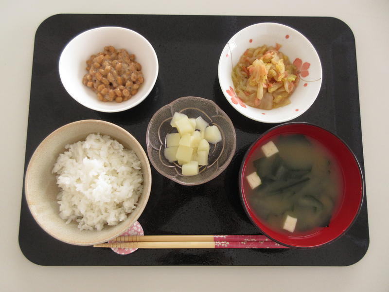ごはん、みそ汁、納豆、白菜の煮びたし、梨のシロップ漬け