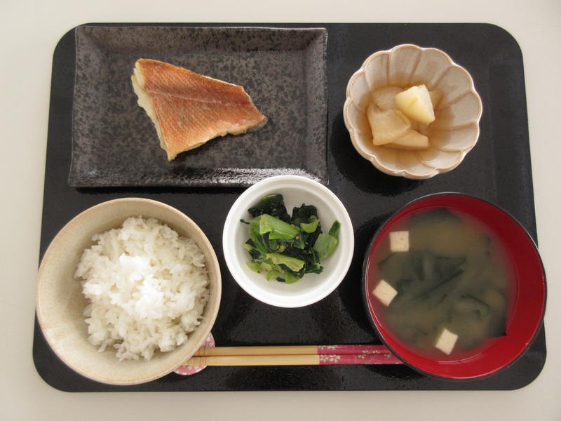 ごはん、みそ汁、赤魚の塩焼き、いか大根、青梗菜のピーナツ和え