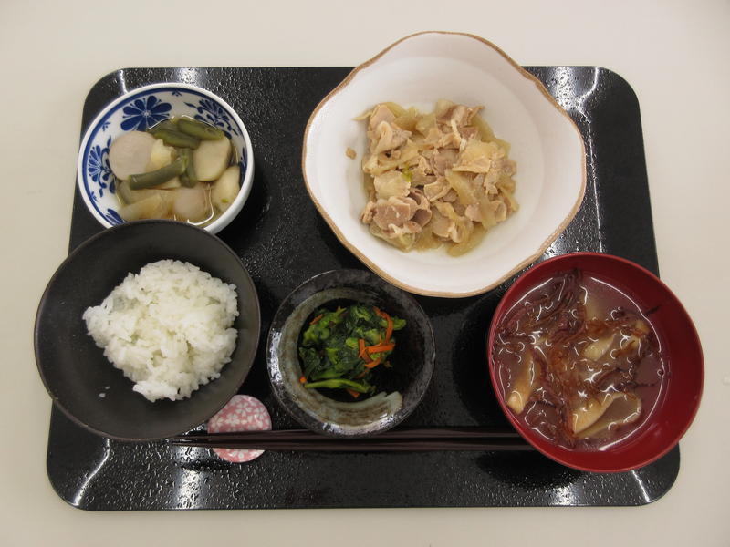 ごはん、みそ汁、豚肉の生姜焼き、里芋の含め煮、菜の花のポン酢和え