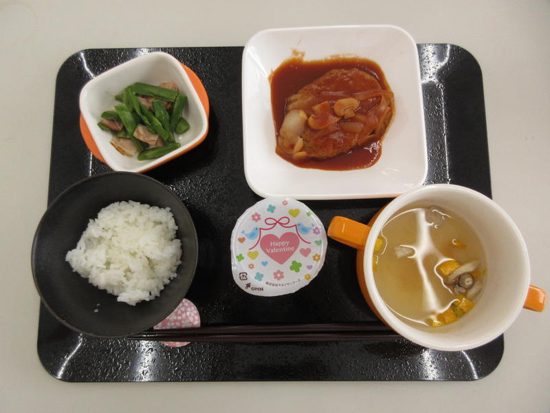 ごはん、コンソメスープ、煮込みハンバーグ、アスパラとベーコンのソテー、ハートのチョコプリン