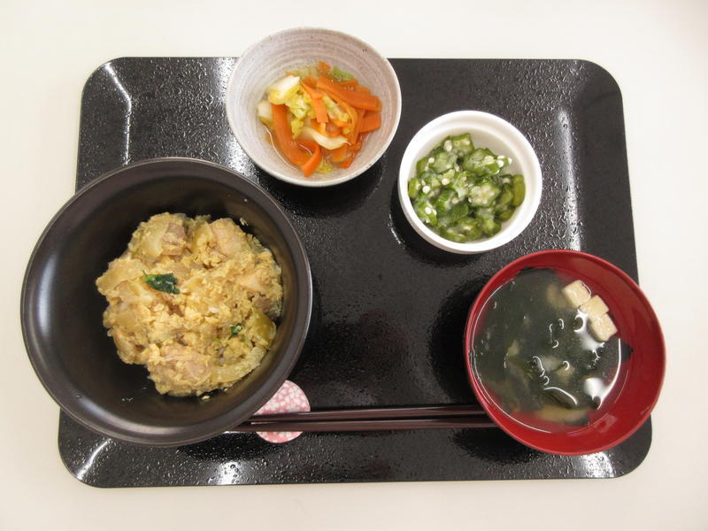 親子丼、みそ汁、白菜と人参の白だし煮、おくらのおろし和え