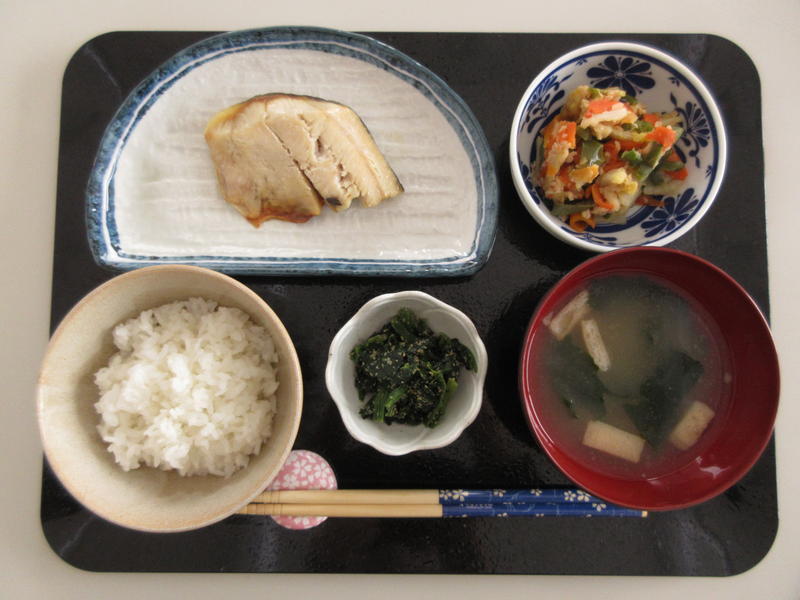ごはん、みそ汁、ほっけの塩焼き、白菜の味噌炒め、ほうれん草の胡麻和え
