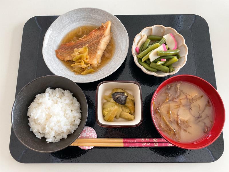 ごはん、みそ汁、赤魚の煮つけ、いんげんと蒲鉾の炒め煮、焼き茄子