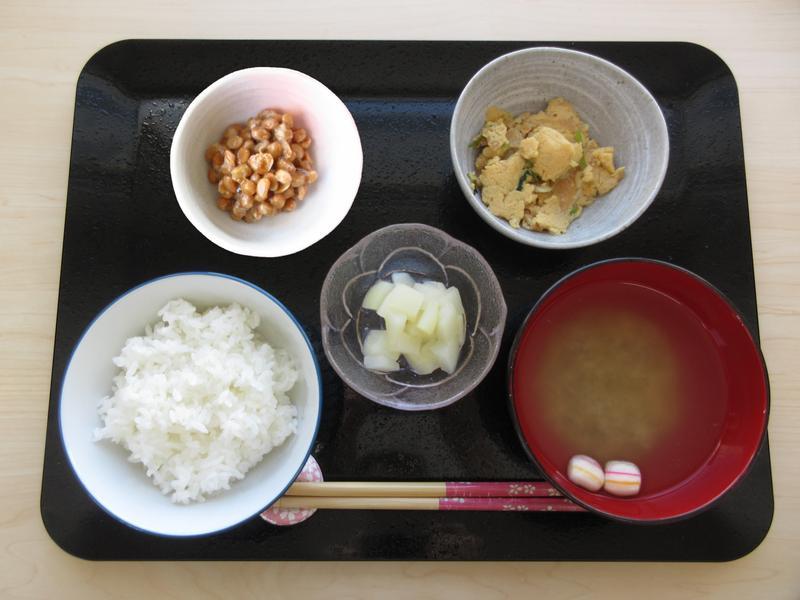 ごはん、みそ汁、納豆、お麩の卵とじ、梨のシロップ漬け