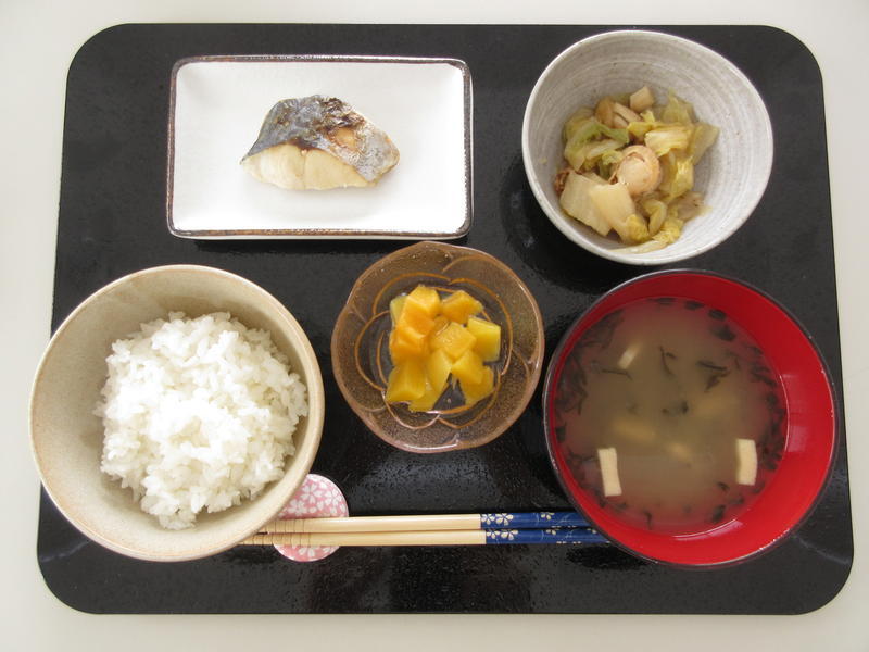 ごはん、みそ汁、さわらの塩焼き、白菜と帆立の煮物、桃のシロップ漬け
