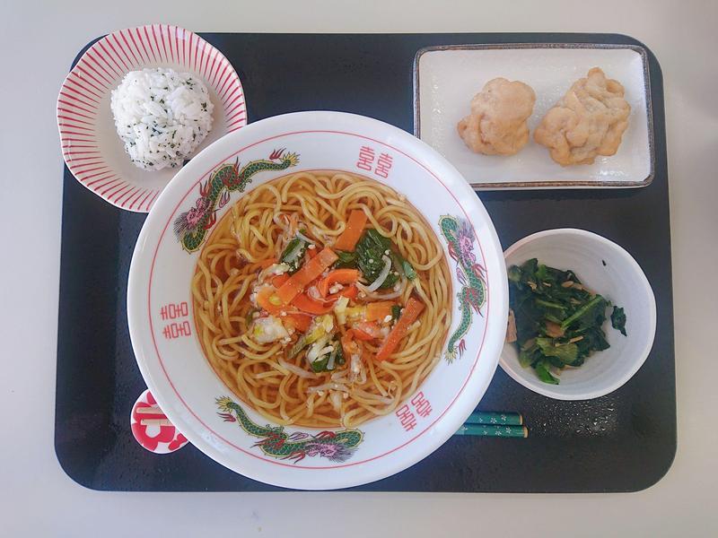 醤油ラーメン、ミニおにぎり(青しそ)、鶏の唐揚げ。青梗菜のなめ茸和え