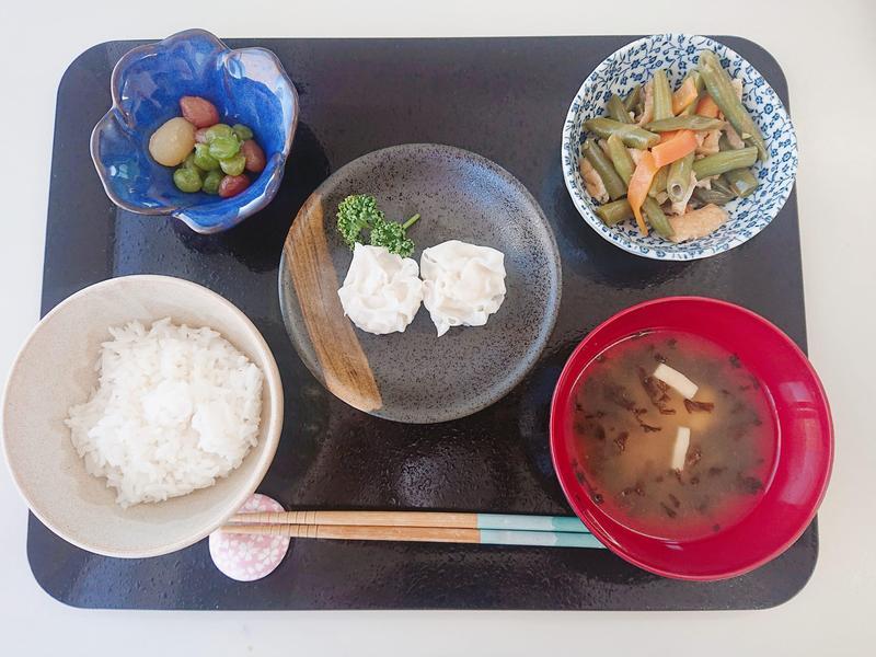 ごはん、みそ汁、豆腐シューマイ、いんげんときざみ揚げの炒め煮、三色豆