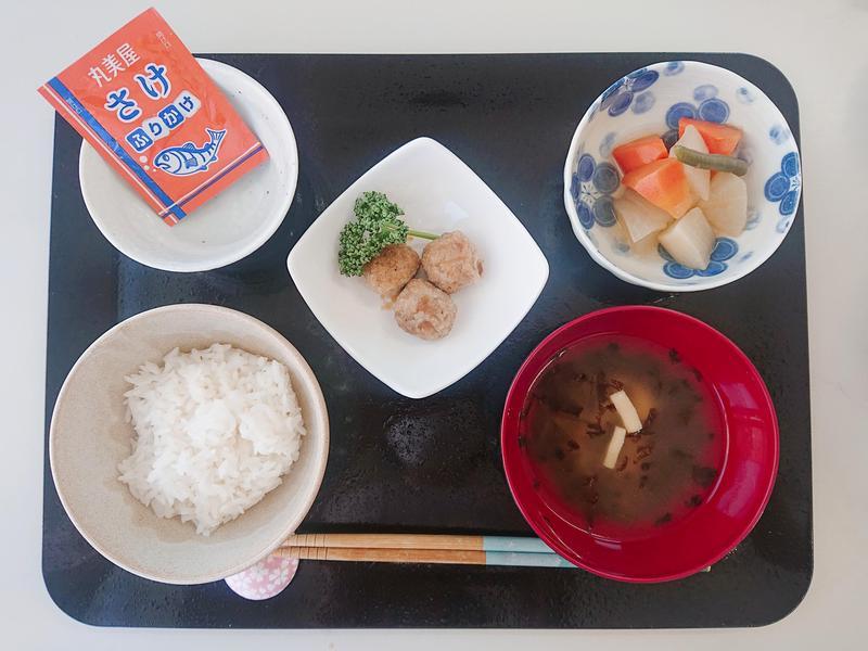 ごはん、みそ汁、和風ミートボール、田舎煮、ふりかけ(鮭)