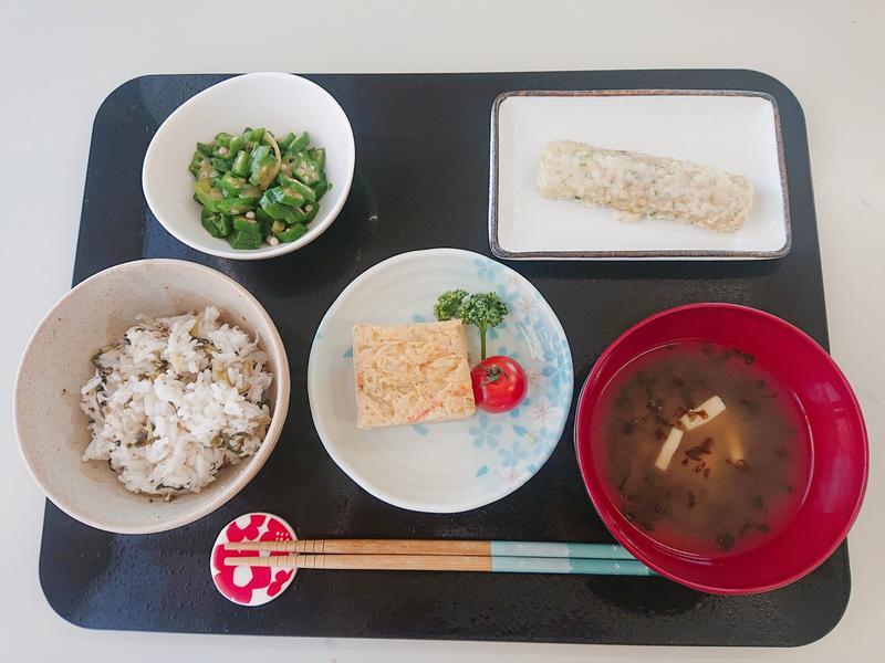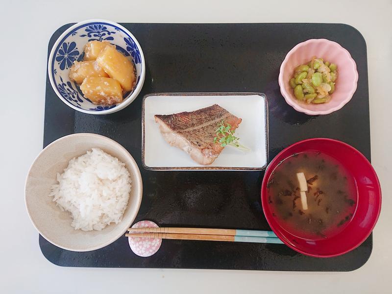 ごはん、みそ汁、メバルのみりん焼き、さつま芋のそぼろ煮、枝豆のおろしゆず和え