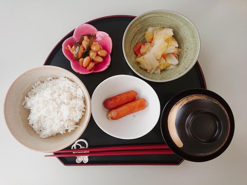 ごはん、みそ汁、あらびきウインナー、白菜の塩炒め、豆昆布