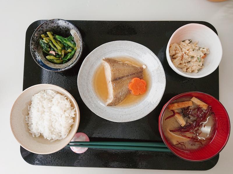 ごはん、みそ汁、かれいの煮つけ、卯の花、小松菜の桜えび和え