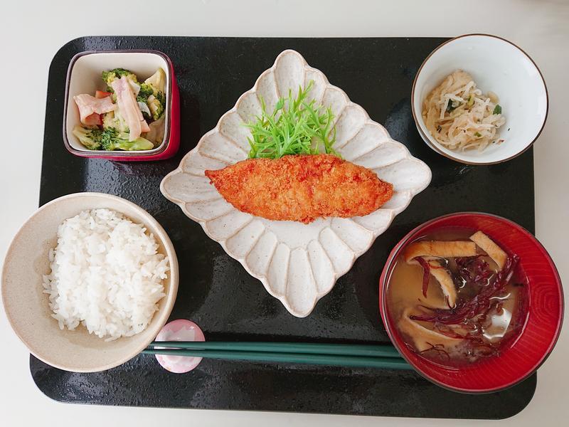 ごはん、みそ汁、白身魚のフライ、ブロッコリーの醤油炒め、大根のさっぱり和え