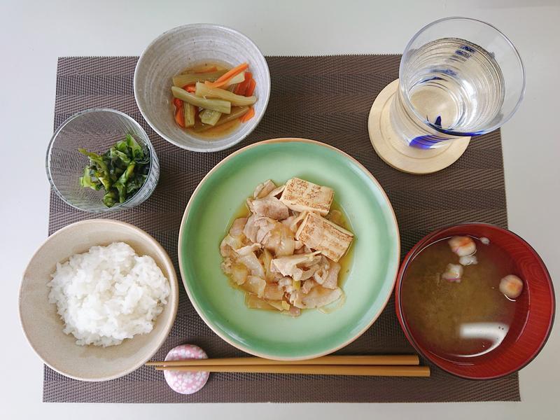 ごはん、みそ汁、肉豆腐、ふきの煮物、胡瓜の酢の物