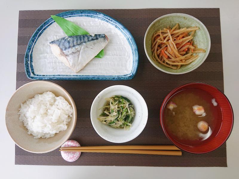 ごはん、すまし汁、さばの柚子味噌焼き、金平ごぼう、和風サラダ