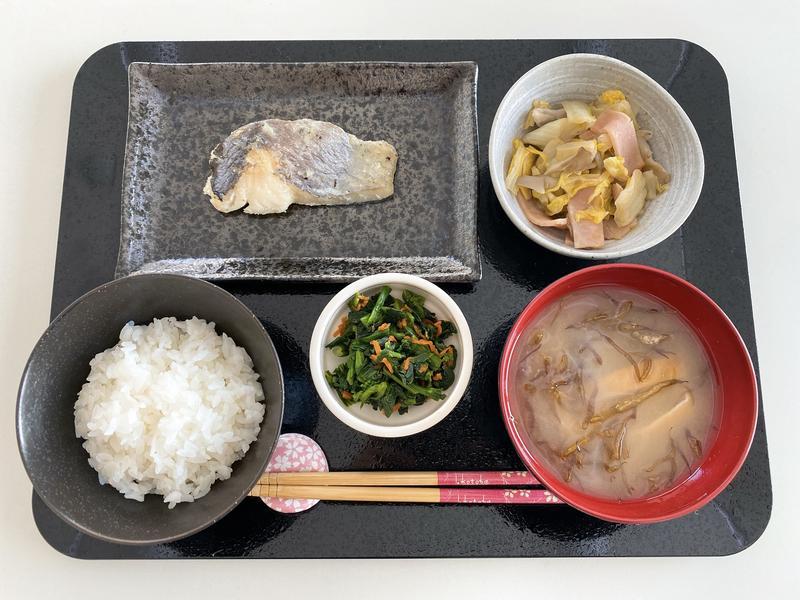 ごはん、みそ汁、白身魚の香草焼き、白菜の醤油炒め、菜の花のおかか和え